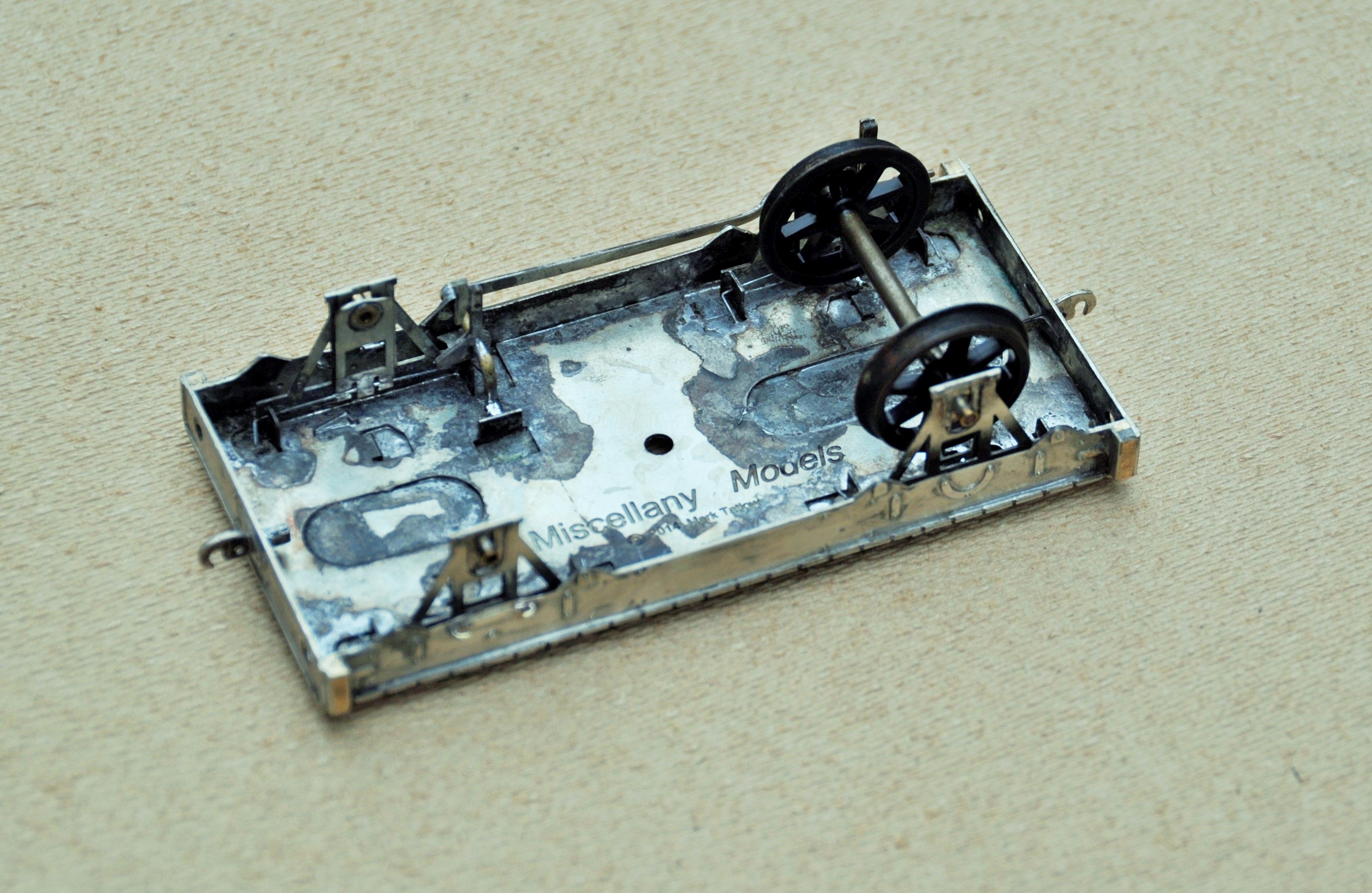As this is my first etched design for a vehicle, I have certainly encountered a number of problems. As the top photograph shows I produced this in both 4mm and 7mm; the latter has proved more successful due to the thickness of metal being greater. The main issue that I created for myself was to half etch the solebar overlays so that the rivets and the ironwork could be portrayed. However, rather than backing them on a further layer of etch (like the etched kits I have built – they evidently knew something……), I spanned it between supports. The intention had been to make the kit fold up more readily but in practise what has happened is that the half etched solebars have distorted (badly in the case of the 4mm one) due to the stresses introduced in the heat from soldering. Thus, whilst I have a working model (at least in 7mm), a rework is going to be required.