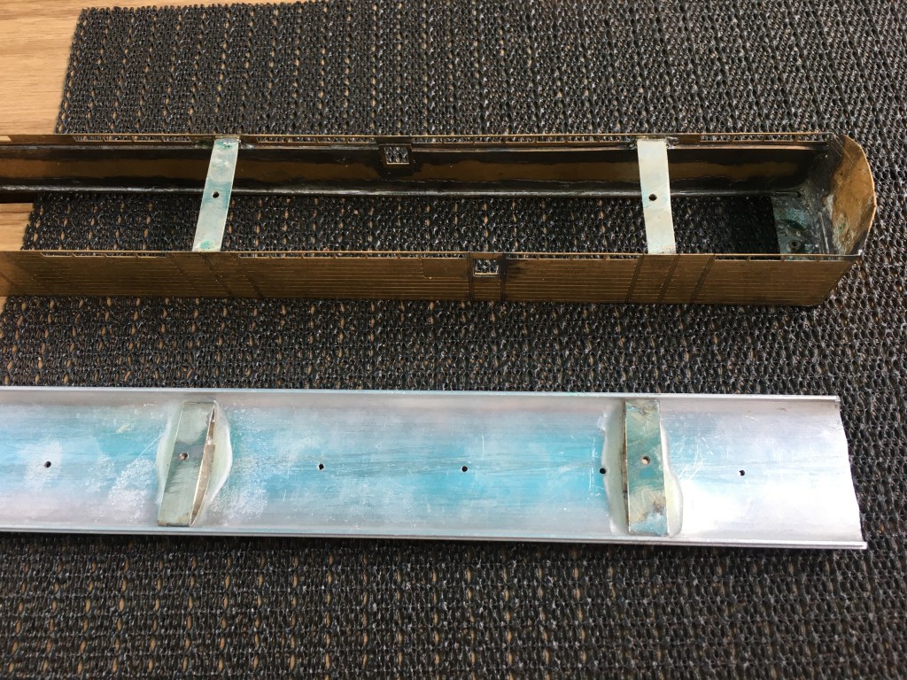 I now build most of my coaches with separate underframes and roofs. I then stiffen these up with a piece of 1*1mm brass strip at the head and 1*2mm at the base. The row of fan lights to these coaches meant that the former needed to be lower than I would have preferred and it needs the lip on the roof to keep these straight and in place. It is also necessary to put in some spacers to keep the side walls appropriately spaced without bowing. These provide convenient place to affix the roof with as can be seen here – although I did find the aluminium rather difficult to get the glue to attach to, it took no less than four attempts and a fair amount of liberal spreading!