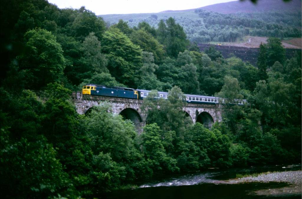 And to sign off, this is an image from about the same place approximately 80 years later in July 1985; a class 47 on what is probably the northbound Clansman service from London Euston (photo by Eastwood 4117). The trees have gown up somewhat in the intervening years – as they have since, the view is largely obscured now but the walk along the river is still worthwhile if you are in the area.