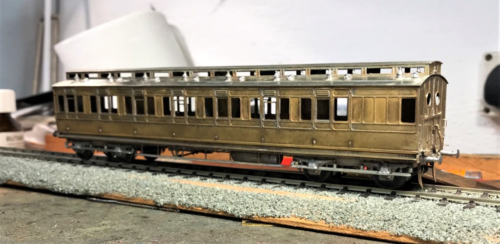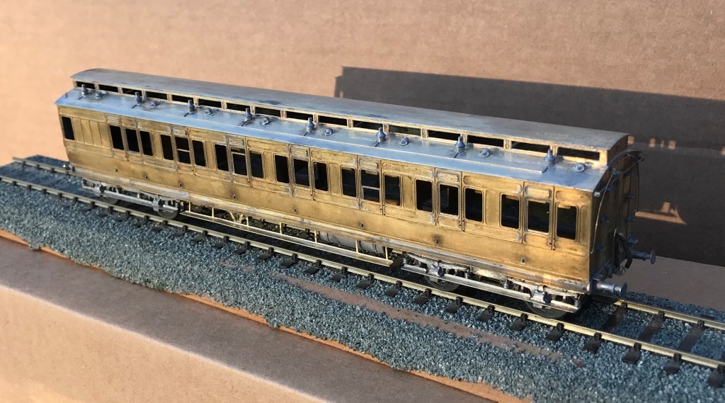 All of the coaches were constructed from D&S kits on my Miscellany Models Fox bogies with replacement roofs formed of nickle silver sheet. I find that the plasticard offering in the D&S kits to be their weakest point. The problem with this is that if you make your own roofs i find you might as well also cut out the section below the clerestory – it makes a huge difference for the coach to be illuminated from above. The issue is, that there is a lot of work in these roofs – I found that for each there was 15+ hours of work just in the roof!