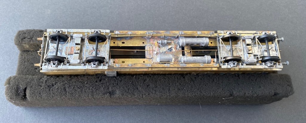 Whilst the basic building and painting/lining of the coach is top notch, there are some issues that I have sought to deal with. First of these is that the bogies are fairly clunky and being assembled from components they are unlikely to be truly square. Thus, I have disassembled these and used them as cosmetic sides to some Bill Bedford sprung bogies.