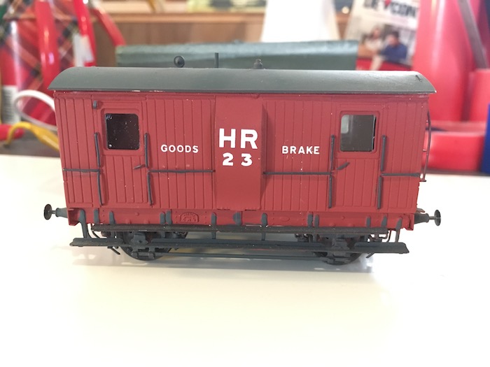 The pair of brake vans above are to HR diagram 39 from 1922 and are from a Lochgorm Models kit. There is some doubt whether they were delivered in 1922, as there are no known pictures of any of them in HR livery. However, I applying the “its my trainset rule” a number of modellers have painted them in Highland colours; including Paul Bannerman whose example is below.