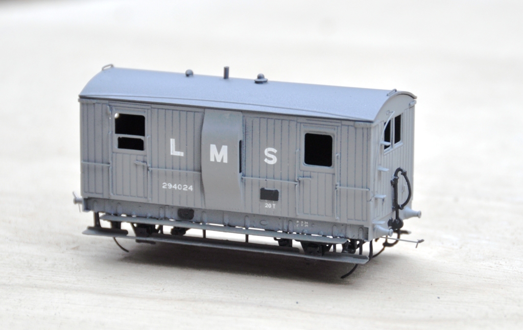Back in March 2013, I completed a dia 39 goods break. These were the final Highland Railway break vans and it is not clear that they were actually finished prior to the end of the HR era. Given that I model in the mid 1920’s, I am quite content to do this in LMS grey which to date I have not seen the model depicted in! The main body painting has been completed and the van has been lettered but weathering, the interior and final detailing/glazing is still to be completed. Based on the Lochgorm Models kit with minimal adjustments (a few pipes below the chassis and sprung W irons in lieu of the compensation provided in the kit) this is what it presently looks like: