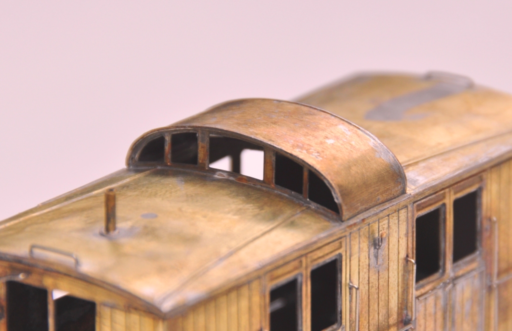 This is the early style lookout for the dia 12 Highland Goods Brake. As originally built these lookouts formed by a single slot to the centre of the roof and were fully glazed to the front and back. In use guards complained that they caught their heads on the lip of the roof as they climbed in. To overcome this, many of the vans were rebuilt to include ramped approaches to the centre of the lookout were incorporated, to become what was arguably the signature feature of the Highland’s rolling stock.