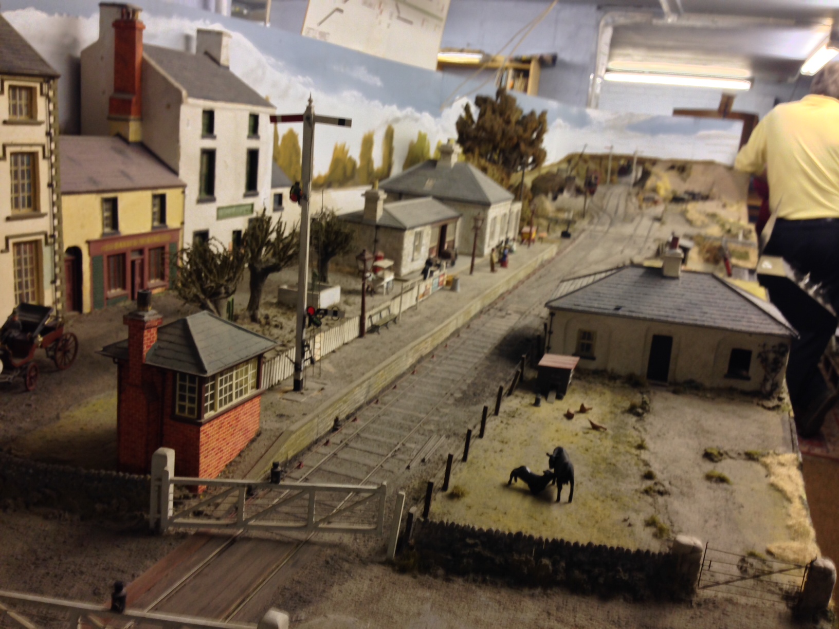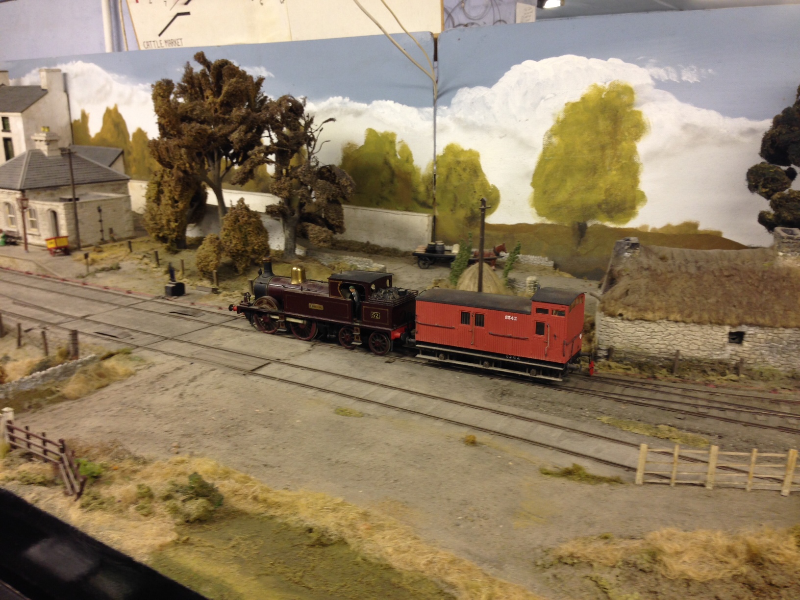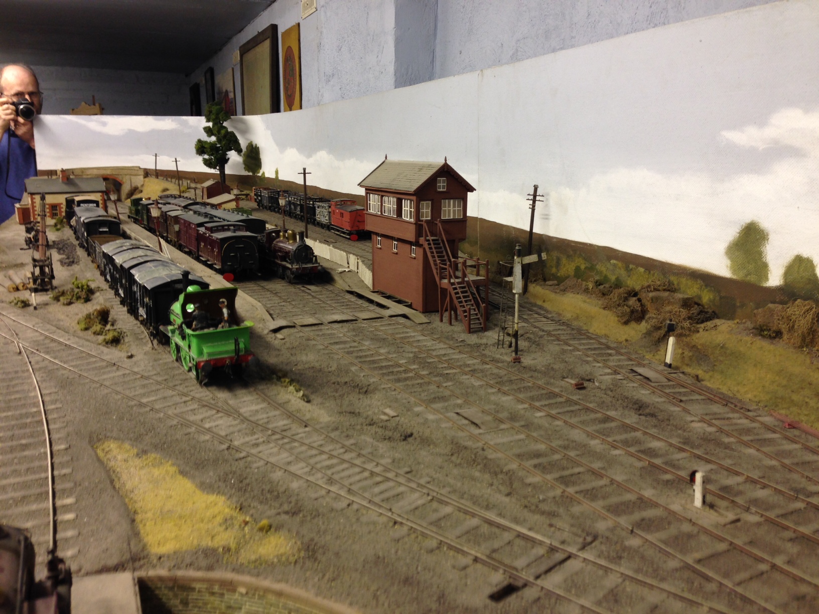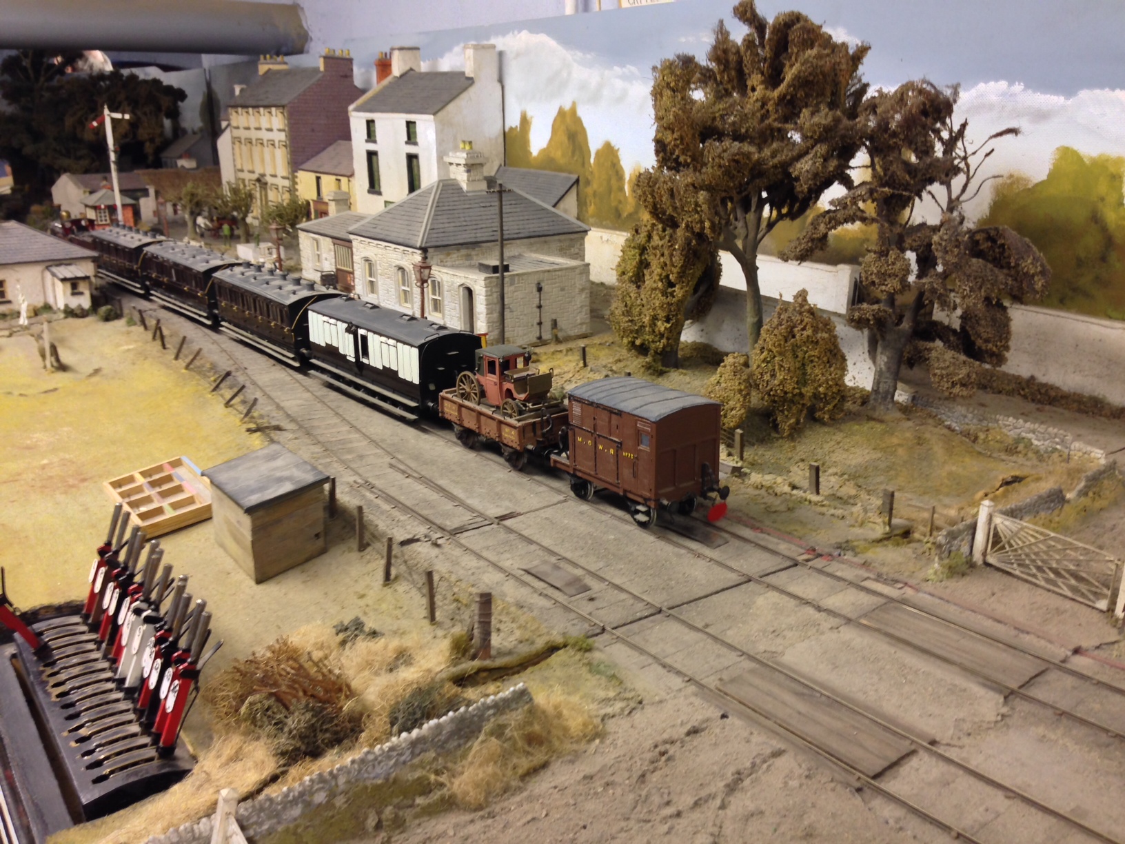 Castle Rackrent is both an individual layout and also a system; comprising a total of five stations, a harbour and a couple of fiddle yards. It is based on Irish practise, so is all hand built to 5’3″ gauge. Given that the layout is 7mm/1ft, it is pretty substantial and wraps around Richard’s basement a couple of times. This creates the situation where it is somewhat of a challenge to know what is going on in any other location on the system – this does not matter as the stations communicate with each other via bell codes (well, only one adjacent station in our case due to a fault, so we adopted a version of the telegraph system known as shouting!).