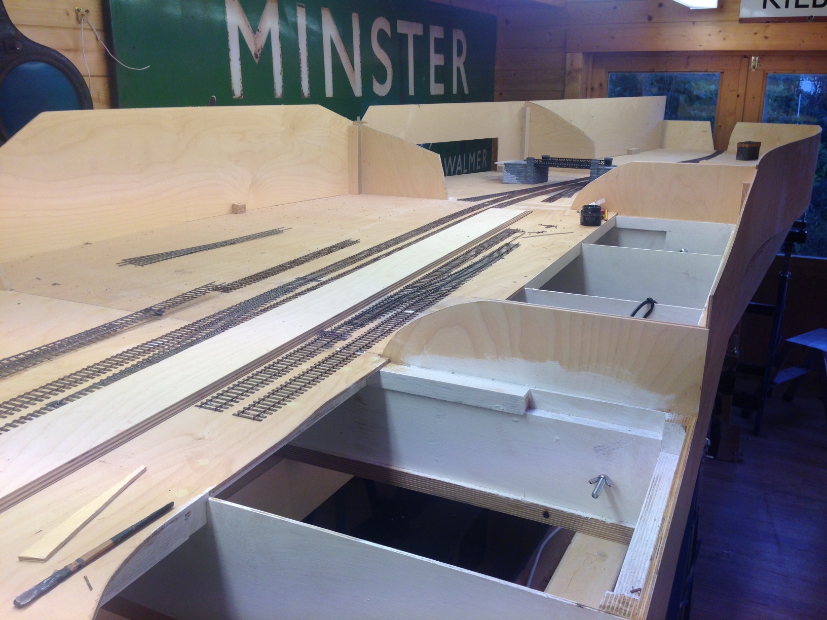 Matters have been progressing with the layout on and off through the summer and a lot more of the track has now been laid. We have both the main line and the full run around loop complete, along with most of the bay and its run around loop too.