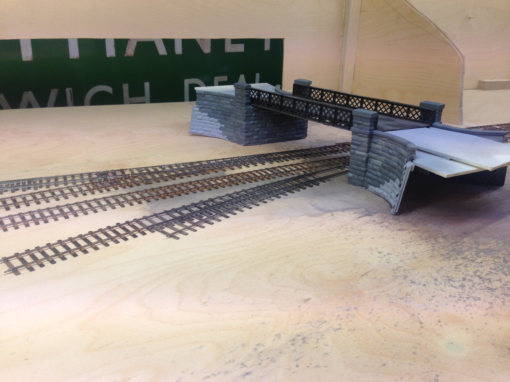 I have also placed into its approximate position the road overbridge that separates the shed from the main station area. The construction of this can be seen in postings here and here. The intention of hte bridge is to act as a scene blocker and thus to compel the watcher to view the layout from more than one location to appreciate it.