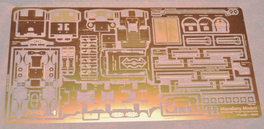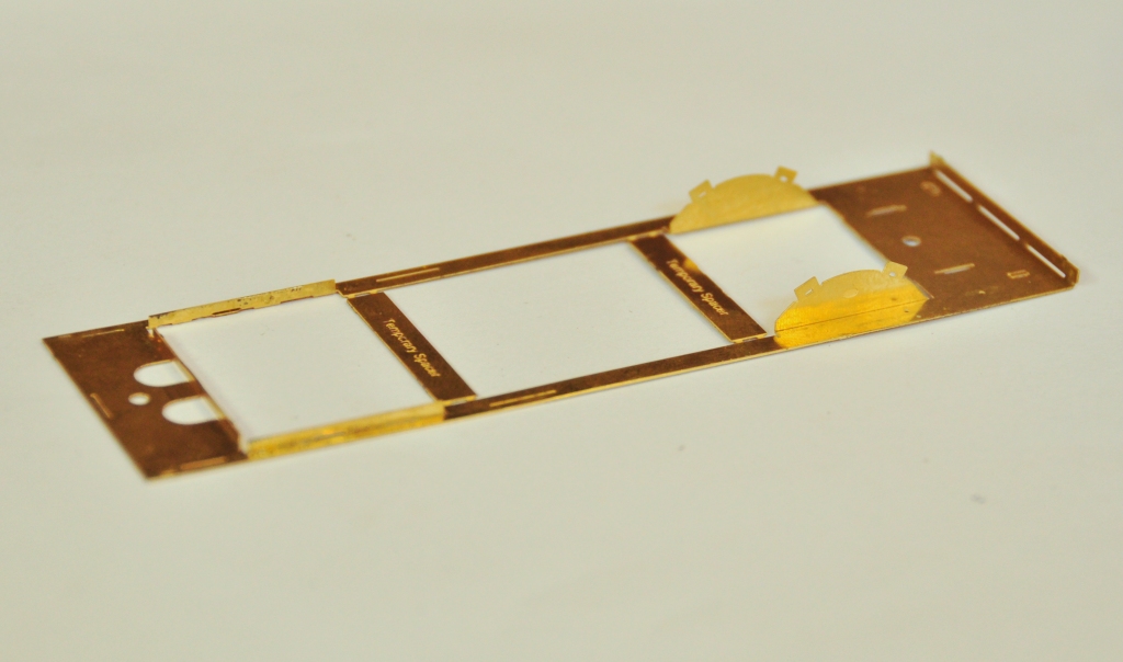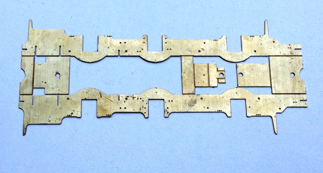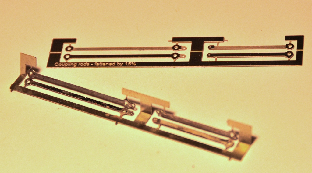 As is not uncommon, these are made from a pair of layers of brass laminated together. You can see that the outer layer is half etched for much of its length, with the full depth only being present at the bosses. I have also sought to make it easier to build these by including them in a folding jig – the folding is underway in the bottom portion of the view. The logic of the jig, indeed the whole kit, is to make a really smoothly running chassis much easier to make. Modern CAD and computer operated phototool creation techniques by the etchers means that it is possible to easily draw and then etch such that each dimension is faithfully repeated on the product. Thus, it is possible to be confident that the wheelbase will be repeated exactly on each side of the frames and also on the coupling rods. However, this accuracy is completely lost if the user has to laminate the two parts together by hand; it is not possible to get them superimposed on each other exactly or repetitively so the spacings of the crankpin holes will change. The jig overcomes this as the fold line is so long that there can not be any twist as it folds, so the two parts will meet consistently and accurately.