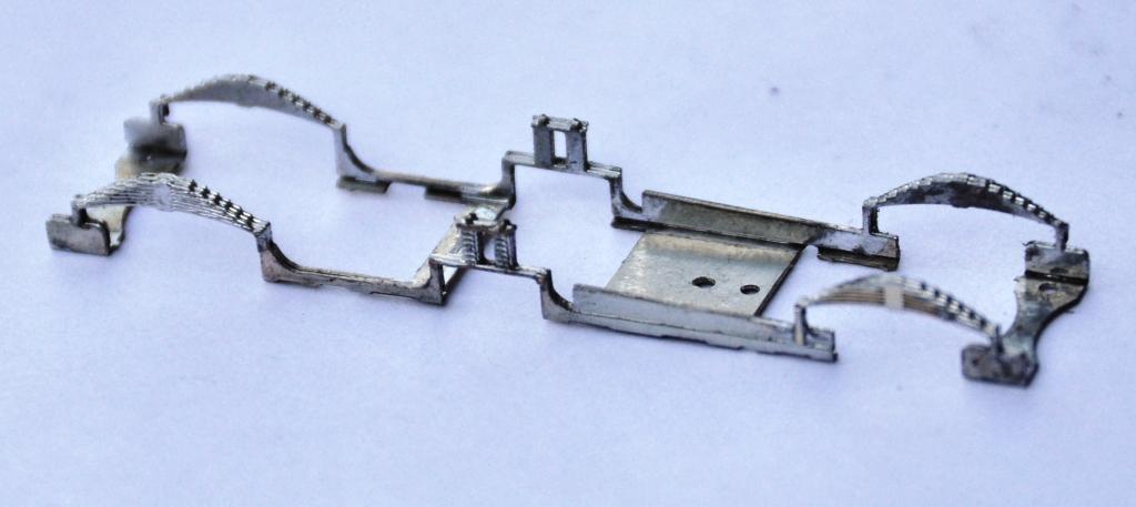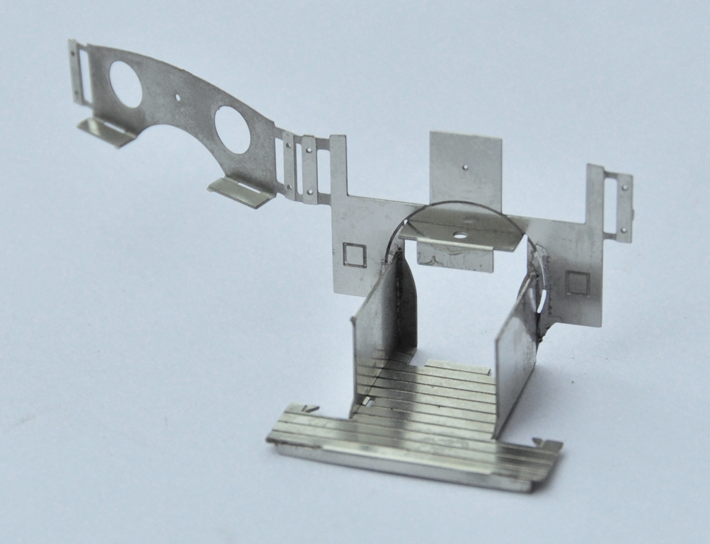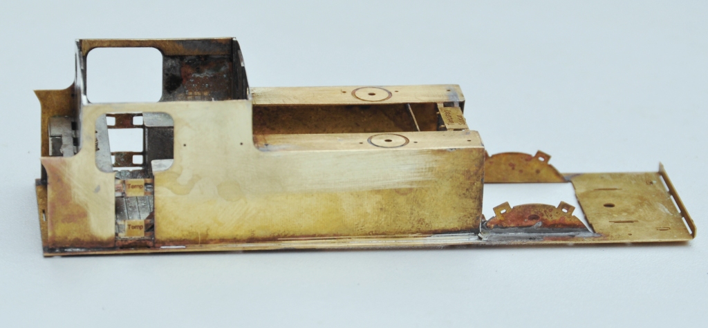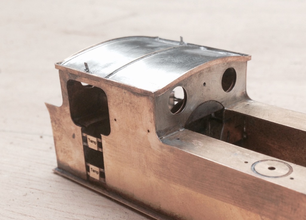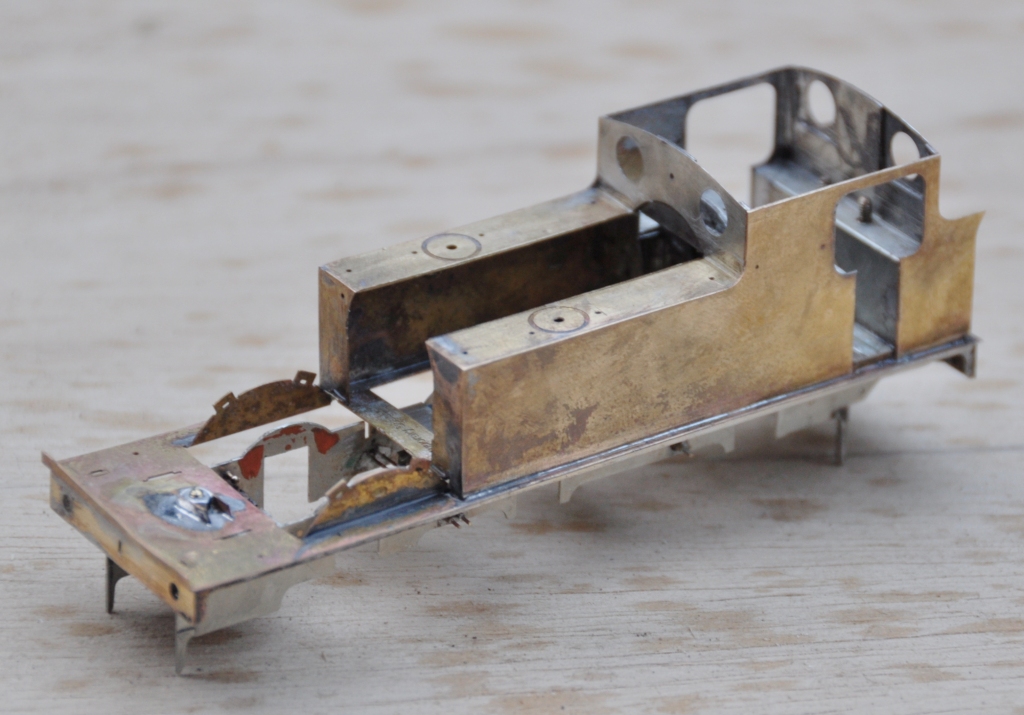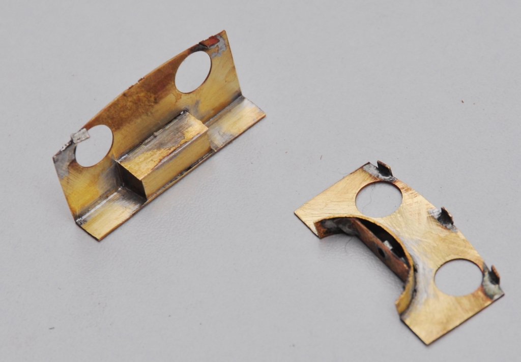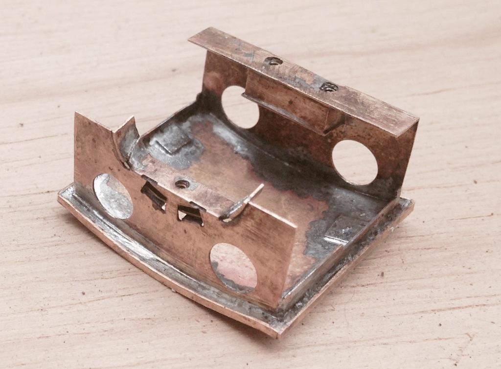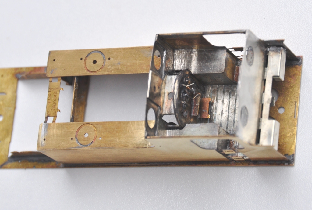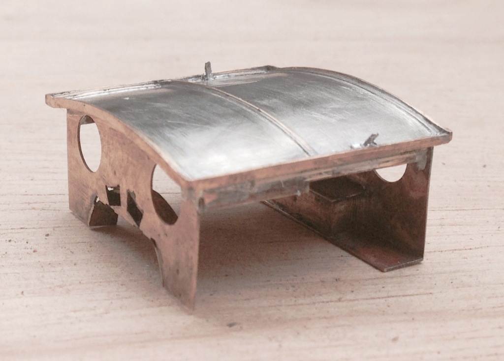 The two tanks, along with the sides to the cab/bunker, are conceived as a single piece (if you go back to my previous posting, you can see this in the flat in the etch). The two halves are separated by temporary spacers to both assist in locating them but also to give strength to the assembly prior to the fitting of the boiler which is where it will get its strength from. It was when I tackled this part, I reached the first disaster – the etchers had failed to half etch from behind so I was missing some fold lines. This was pretty frustrating as it entirely negated the intended efficiency of the design and even though I now have a corrected etch, I had to solder on by cutting the parts at the intended line of the half etch and soldering them together in the more traditional manner – exactly what my design was intended to avoid. As a result of this, there are no neat photos of the tanks being folded up and secured in place, we have to jump on a bit to see this.