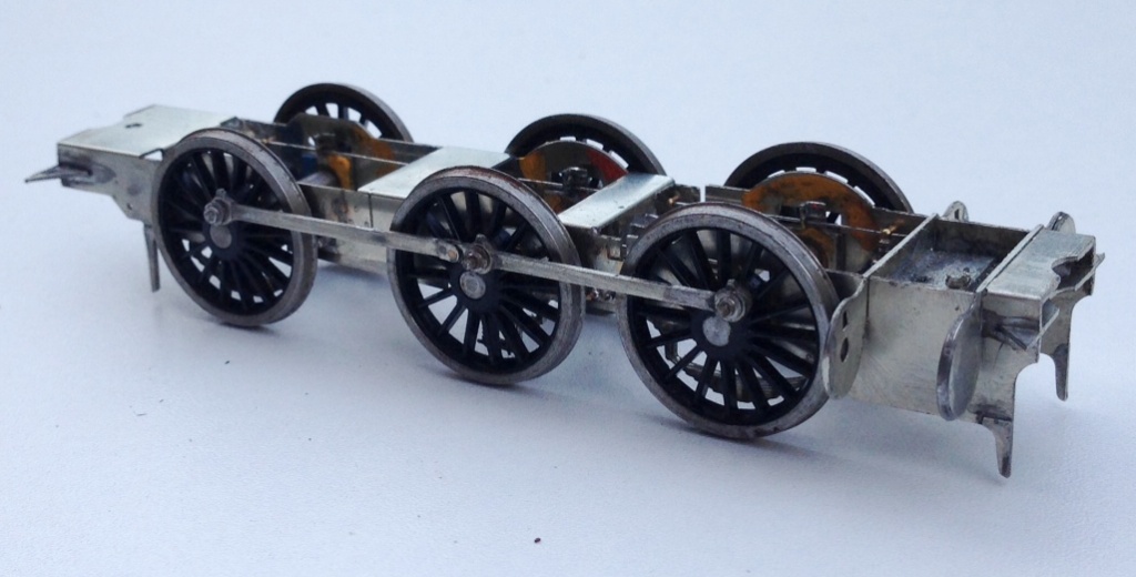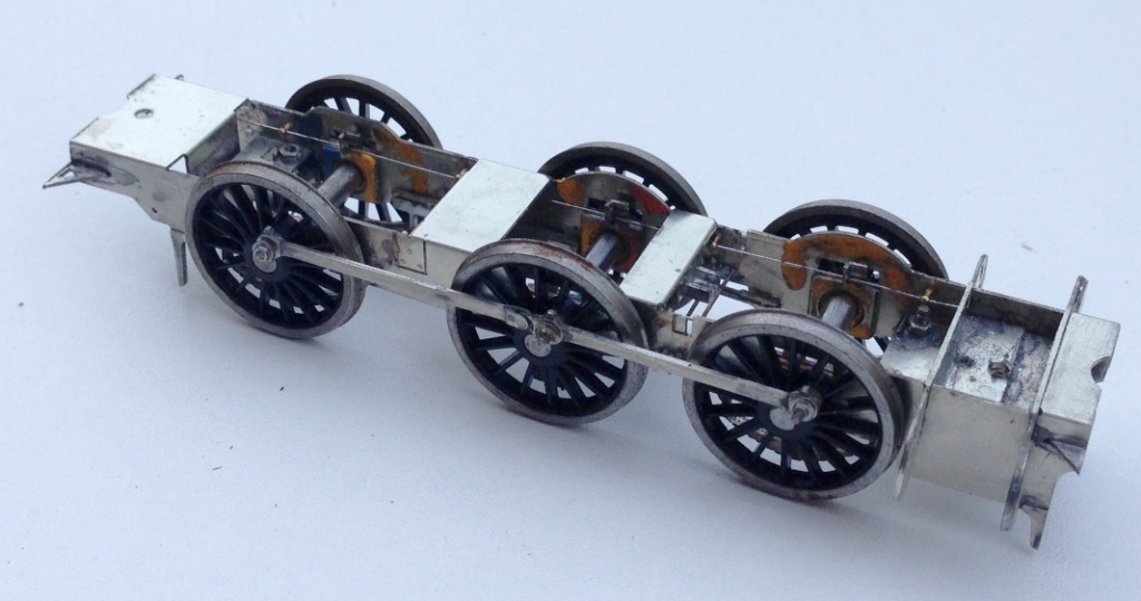 The chassis is created around CSB’s; continuous springy beams. A spring wire is anchored to the chassis at four points per side (for an 0-6-0) and at the centre of each hornblock. Thus each hornblock is supported on either side and can “bounce” on the spring. However, the clever thing about CSBs is that when a hornblock is depressed, not only does the spring wire flex a bit as suspension, but it also rocks on the anchors so the adjacent wheels push downwards a bit to equalise out some of the deflection. It produces a really smooth chassis and, if it is conceived at the design stage, I think is actually rather easier to both design and build than traditional compensation. This is a close up of a pair of hornblocks and a pair of the anchor points (the other is hiding behind the frame spacer on the right). Also worthy of note is the colour coding of the hornblocks; to enable them to be reinstated in the same hornguide each time. This is probably unnecessary with modern (and therefore consistent) hornblocks and the accuracy of the etching I have noted but old habits die hard!