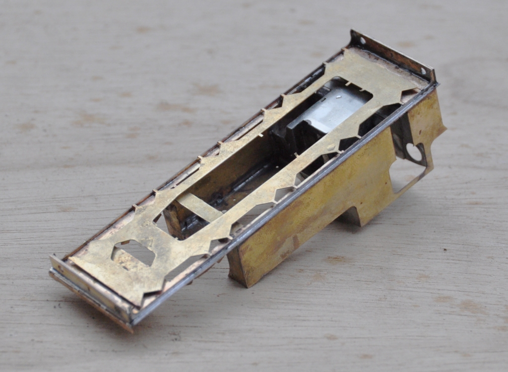 With this, it is a doddle to fit the valences in their correct place and solder them without distortion. I did find that the running plate flexed significantly at the end of the tanks; so the final version is going to include a pair of temporary stiffeners that fold down and stop this. This would be the moment when they are removed to allow the valancing to take their place.